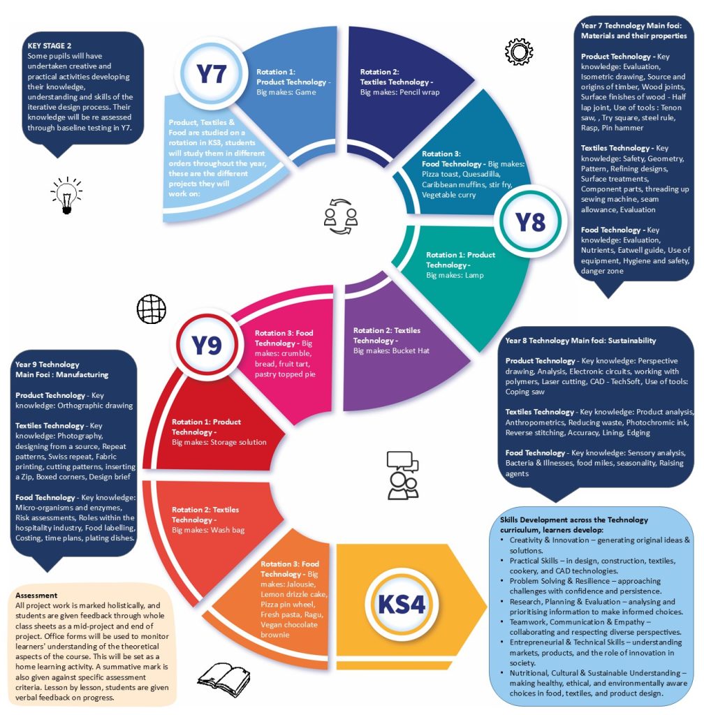 Our aim in Technology is to develop curious, confident, and creative young people who are equipped with the knowledge, skills, and resilience to thrive in a fast-changing world. We provide a vibrant and diverse curriculum that introduces learners to a broad spectrum of design, engineering, textiles, and food disciplines.
