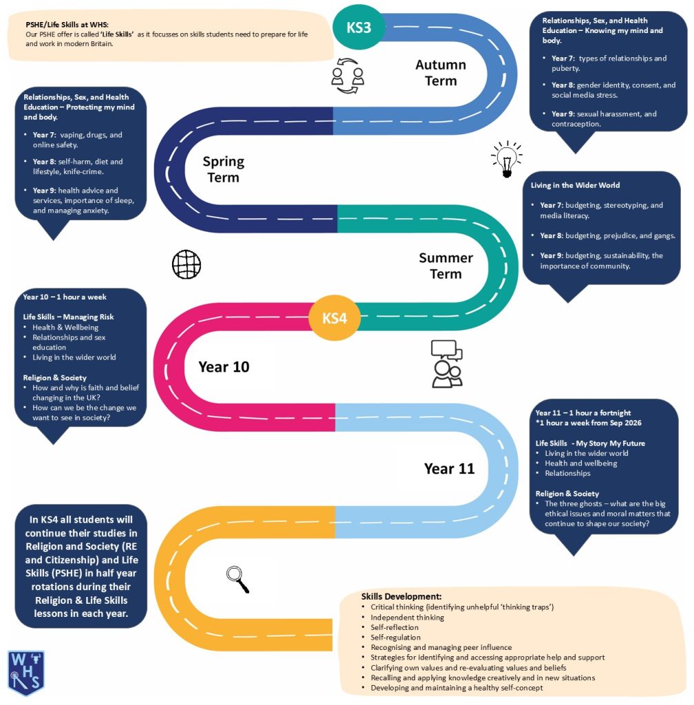 Life Skills is a programme that empowers students to have choice and control in their lives. Students will develop the knowledge, skills, and virtues needed to keep themselves healthy and safe and to prepare them for life and work in modern Britain. The Life Skills curriculum is tailored to suit the specific needs of our Westhoughton students to ensure their learning is relevant to the ever evolving world they are growing up in and equipped with the knowledge they need to look after themselves and others. Additionally, the lessons are designed to promote curiosity and criticality, skills that are essential for a life long love of never stopping learning. The three strands of the Life Skills curriculum, Relationships and Sex Education, Mental and Physical Health, Living in the Wider World, are all taught from an objective and factual position thus providing our students the space to develop their own informed views and opinions whilst also being tolerant, understanding, and respectful of others. The curriculum is delivered in an age-appropriate, cyclical style ensuring that students revisit key topics to develop and embed their learning. We understand that poor mental health is a barrier for some students to fully access their education and therefore we provide, through our Life Skills lessons, fun and practical workshops to help students develop coping strategies, build their resilience, and learn emotional regulation so that they can enjoy their time in school.